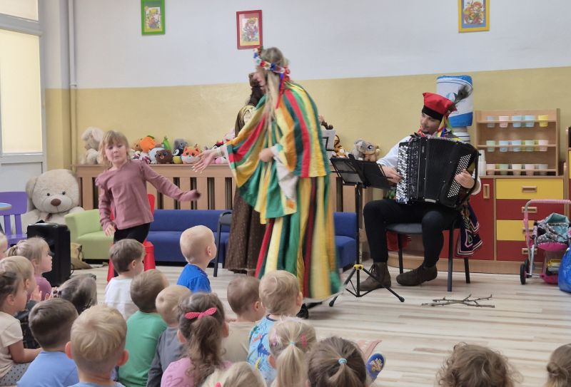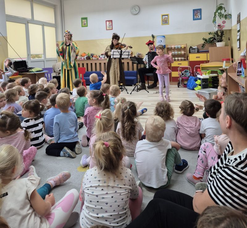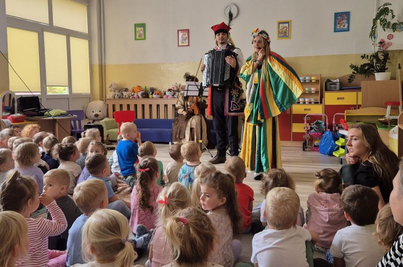 Dnia 6 października po raz pierwszy w tym roku szkolnym nasze przedszkole odwiedzili artyści z bajkowym koncertem pt. "Pyza na Polskich dróżkach". Poznaliśmy polskie tańce narodowe min: poloneza, kujawiaka, oberka i krakowiaka. Słuchaliśmy utworów granych na skrzypcach, akordeonie i gęśle.