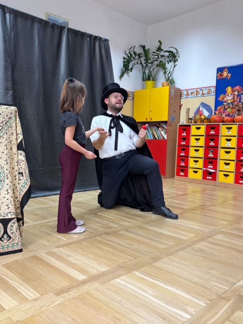 „Program edukacyjno - artystyczny z elementami iluzji”.Dziś, w naszym przedszkolu, gościliśmy iluzjonistę. „Czary”, które nam pokazywał sprawiły dzieciom dużo radości!