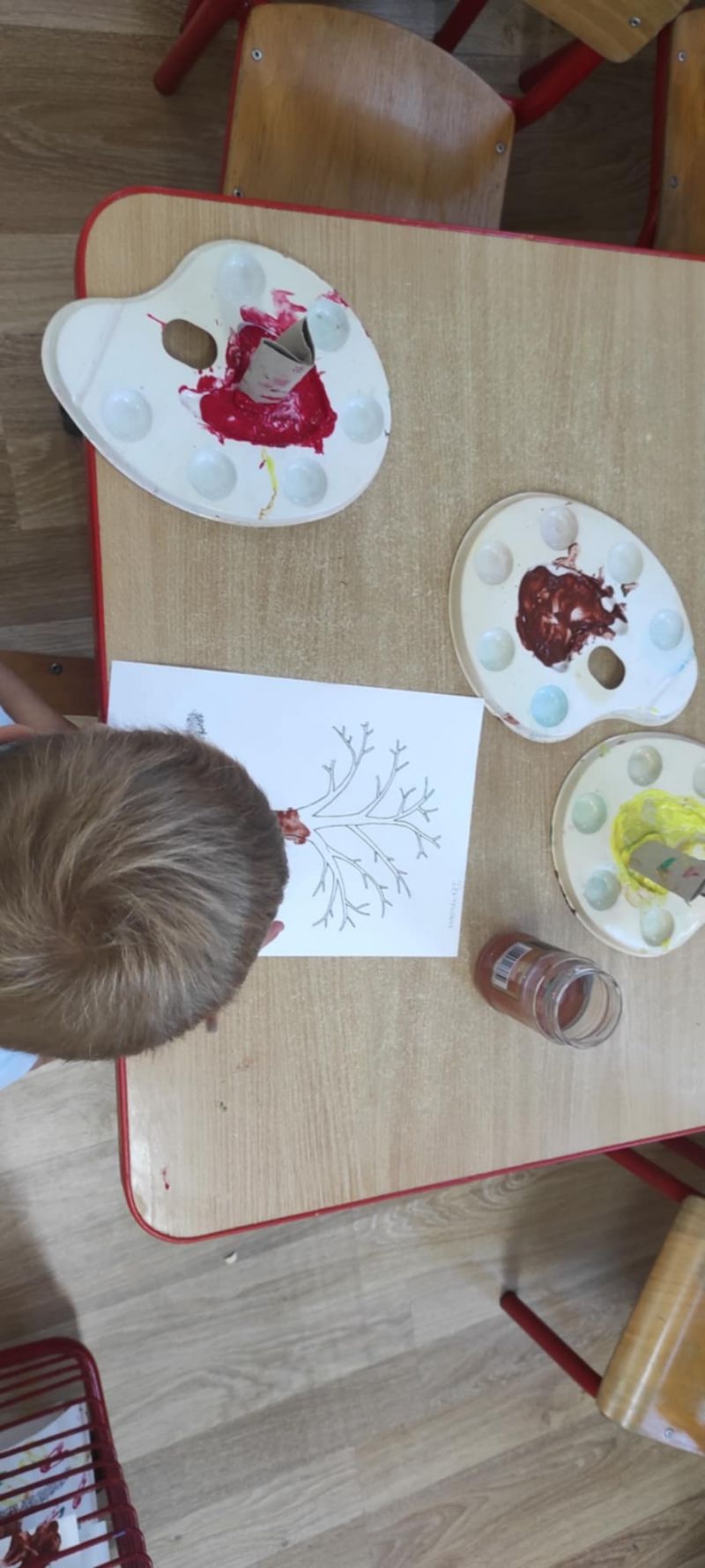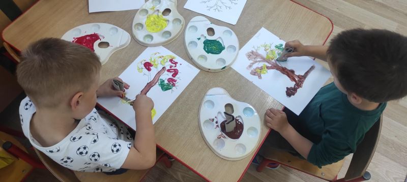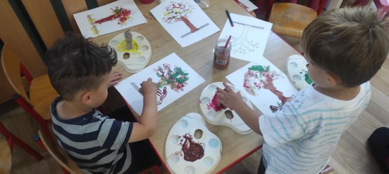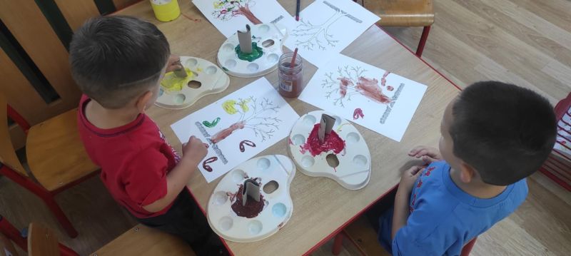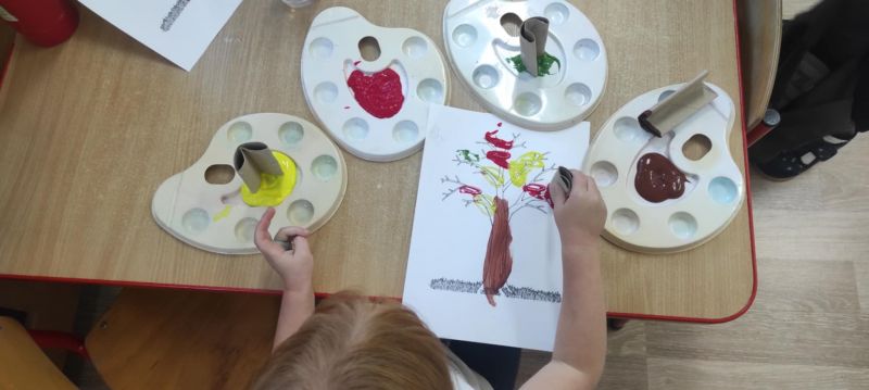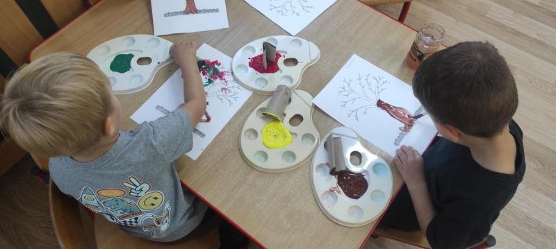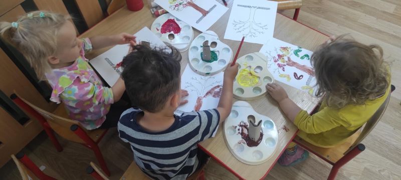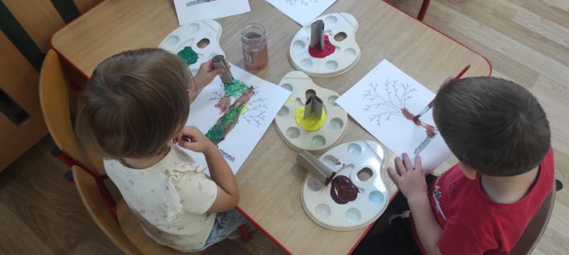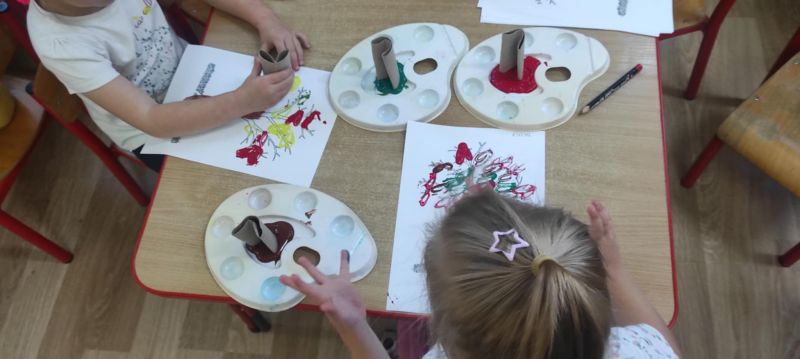 Wiewióreczki wykonały pracę plastyczną. Doskonale bawiły się malując pędzlami i odbijając kształty za pomocą niecodziennych stempli.